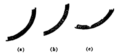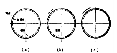 圖2 澆注料初凝時間不小于45分鐘,從拌料到澆注完畢一檔基本上已凝固,澆注后即可轉(zhuǎn)窯至第二檔位置,見圖2(b),并拆掉模板。一般澆注厚度100毫米,轉(zhuǎn)窯后整體沒有開裂、塌落,如果澆注襯料施工要求很厚,可以在襯料表面加模板,使其托住,如窯口澆注。整個筒體圓周澆注一半養(yǎng)護(hù)6小時,使?jié)沧⒁r料進(jìn)一步凝固硬化,見圖2(c),便于下一步施工。 3.施工中注意的幾個問題 ① 此施工方法由于時間比較緊湊,要求有一支比較熟練的施工隊伍(15人),一旦拌料開始要一次將一檔澆注完,因此倒料、加料、拌料、振搗分工要明確,責(zé)任要落實(shí)。技術(shù)人員的責(zé)任主要是控制加水量和檢査振搗密實(shí)情況。 ② 模板支撐要與筒體垂直,與軸線平行,澆注第一檔位置要在筒體底部中央,下一檔轉(zhuǎn)窯時間要控制好。圖3(a)、(c)兩種情況都會影響澆注襯料的整體強(qiáng)度。而圖3(b)中接縫能獲得整體強(qiáng)度最大效果。