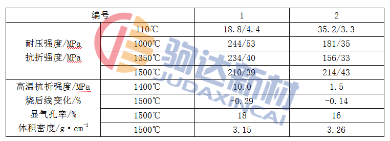 表1-1 硅鋁膠結(jié)合剛玉質(zhì)澆注料的性能