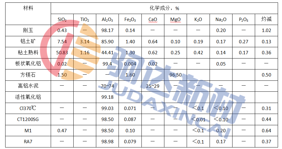 所采用的結(jié)合劑系統(tǒng)除了高鋁水泥外,還包括高反應(yīng)能力的氧化物材料,以及無機(jī)的和有機(jī)的添加劑,它們都具有所要求的流變學(xué)性能。主要原材料的化學(xué)組成列于表1。