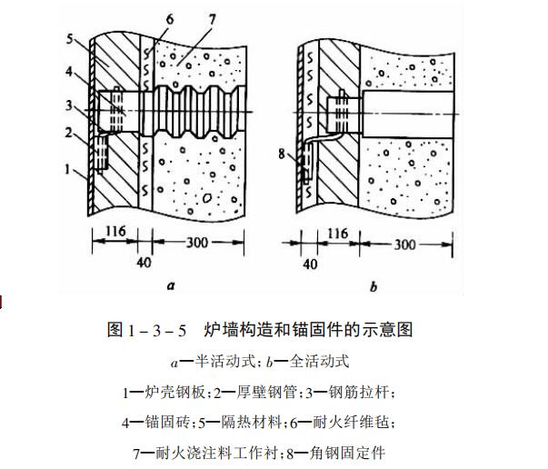 圖中a和b型的不同,還有錨固磚、連接件的長短有差異。鋼筋拉桿用的固定件分別為厚壁鋼管和角鋼,必須與爐殼鋼板焊接牢固。錨固磚的長度應(yīng)滿足其冷端砌筑或澆注在隔熱層中,以滿足施工的要求。錨固磚用鋼筋拉桿與爐殼連接,且為活動式的,錨固磚端面與爐 殼間距應(yīng)≥40mm,這樣能隨著爐墻的漲落而上下移動,也能隨著爐墻的脹縮而左右移動保證了爐墻的穩(wěn)定和長壽。
