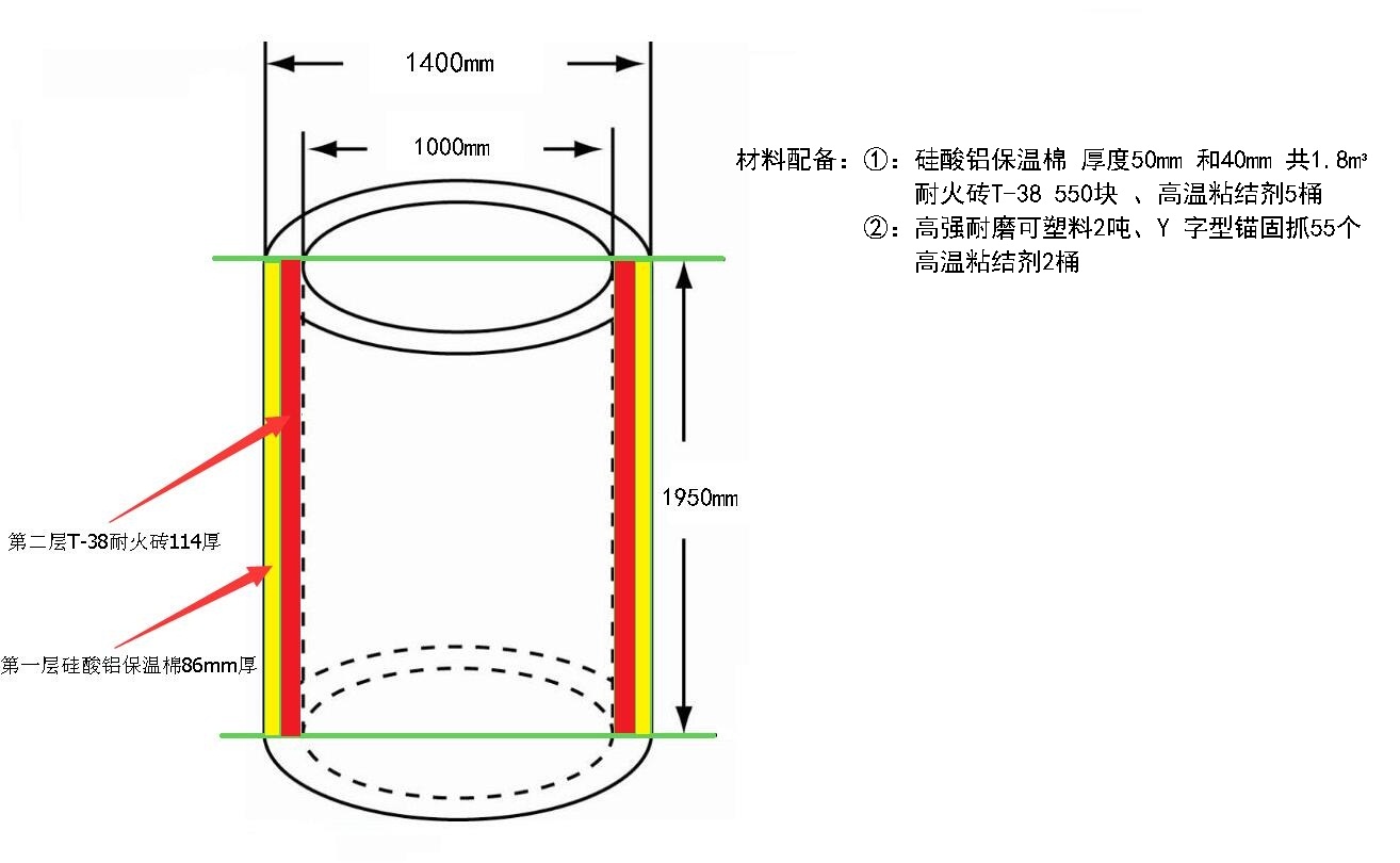 焙燒爐催化劑干燥裝置圖紙,外形為圓筒形狀,其中爐體外徑直徑(不包括管件伸出長度,只包括可利用直徑)為1400mm ,高度到從下底到上口可利用長度為1950mm(不包含爐蓋地方),工況要求:爐內最高溫度450°C,傳導外壁溫度降至50-60°C,爐內耐火材料層砌筑后剩余空間內徑是1000mm。我公司根據上述工況要求和圖紙所標注的材料并結合我公司的經驗給予貴司以下2中方法砌筑方案: